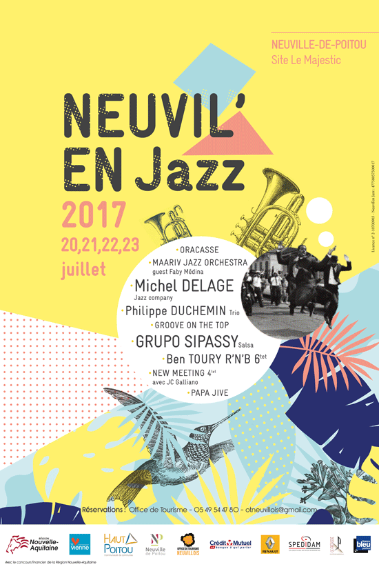 Chaque année, la commune de Neuville de Poitou organise son festival de Jazz. Pour cette nouvelle édition, qui se déroulera du 20 au 23 juillet, Neuvil’en Jazz fera une nouvelle fois vibrer et danser le public avec un programme riche, parmi lequel de nombreux concerts gratuits : Papa Jive, Ben Toury R’N’B 6 tet, Philippe DUCHEMIN trio, Grupo Sipassy, Maariv’Jazz Orchestra, Michel Delage Jazz Compagny…