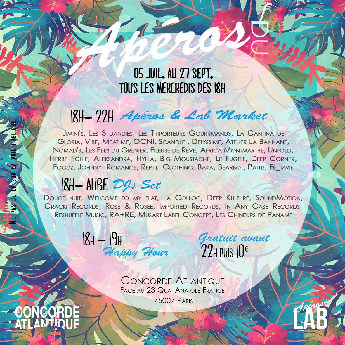 Les Apéros du LAB Festival ont alors lieu sur le sur le bateau du Concorde Atlantique situé Quai Anatole France, du 5 juillet jusqu’au 27 septembre 2017.