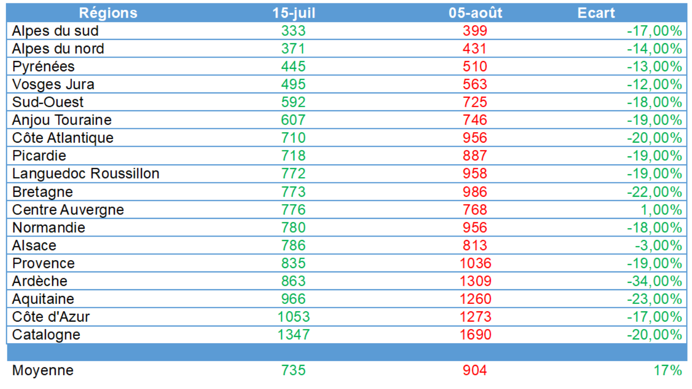 La semaine du 15 juillet observe des prix en moyenne 17% moins chers, par rapport à celle du 5 août, dont les tarifs sont les plus élevés de l’été. Les écarts de prix peuvent aller jusqu’à 34%, notamment en Ardèche. Il est donc préférable de partir en vacances mi-juillet pour profiter des prix les plus attractifs.