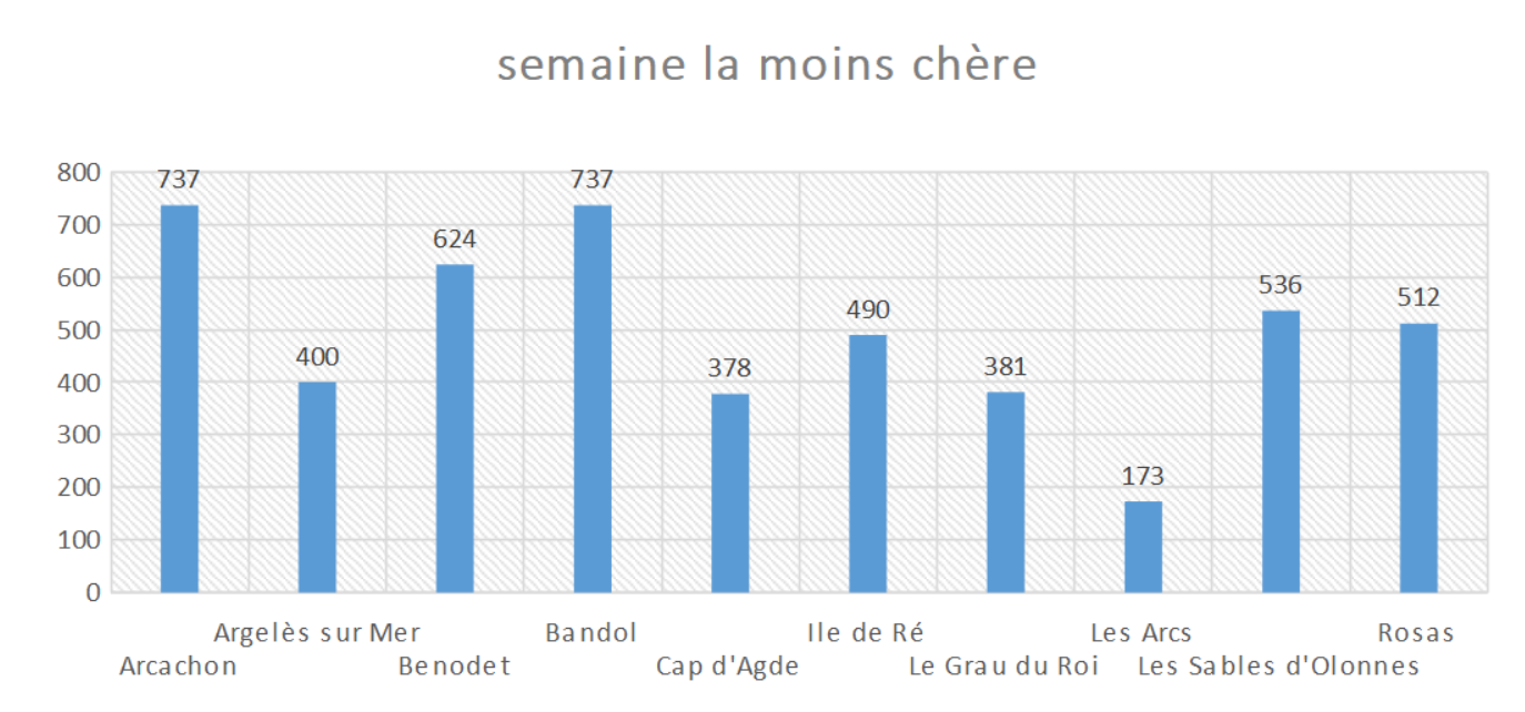 Parmi les destinations les plus recherchées pour l’été 2017, les tarifs les plus intéressants sont bien sûr à la montagne dans des stations comme les Arcs dans les Alpes du Nord (173 € la semaine en juillet), mais aussi à la mer en Languedoc Roussillon (ex : Le Grau du Roi, le Cap d’Agde et Argelès sur Mer) . Ces destinations proposent des offres de locations de vacances n’excédant pas 400 € la semaine pour un appartement 4 personnes.