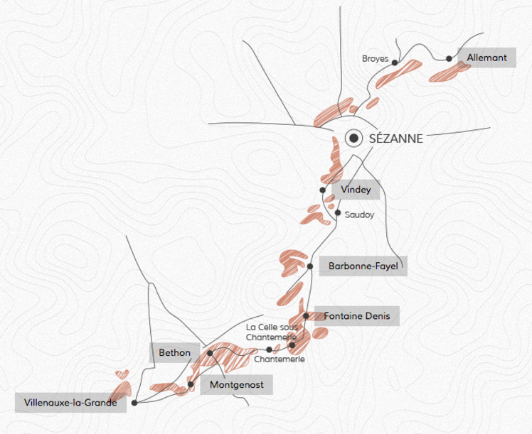 Au gré de pentes douces et harmonieuses, les Coteaux du Sézannais étendent leur vaste territoire d’Allemant à Villenauxe-la-Grande, constituant ainsi les vignes champenoises les plus proches de Paris. Des châteaux aux églises en passant par les dolmens ou les souvenirs des combats de la première Guerre Mondiale, des sols argileux aux sols sableux, histoire et nature se mêlent en un terroir unique.
