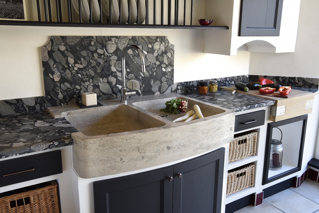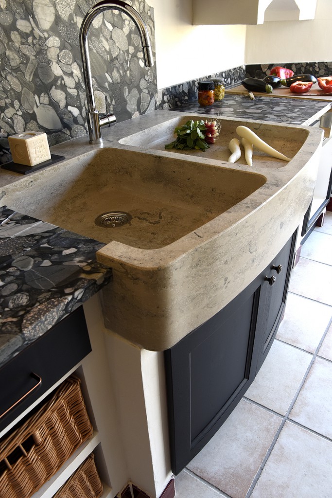 L’évier en pierre taillé dans la masse, est entouré de bâtis réalisés sur mesure… comme un clin d’œil aux pompes à eau d’antan qui ornaient les murs de pierres sèches.