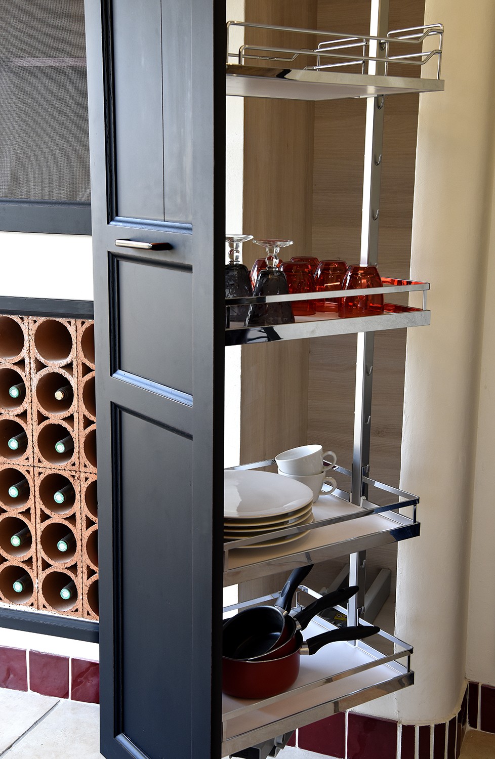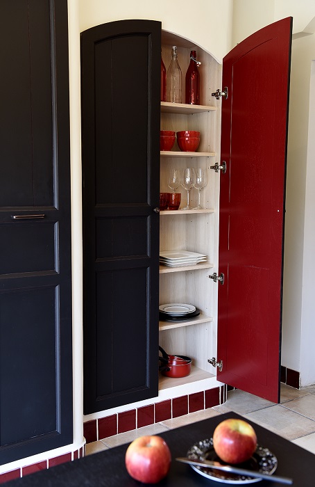 Moderne et contemporaine, elle met à l’honneur des matériaux de qualité : chêne massif laqué noir et rouge, plan de travail en granit naturel Marinacce, crédence en carreaux de ciment de Carocim, fourneau de chez Lacanche et évier provençal en pierre grise du Jura font ainsi partie de cette cuisine provençale.