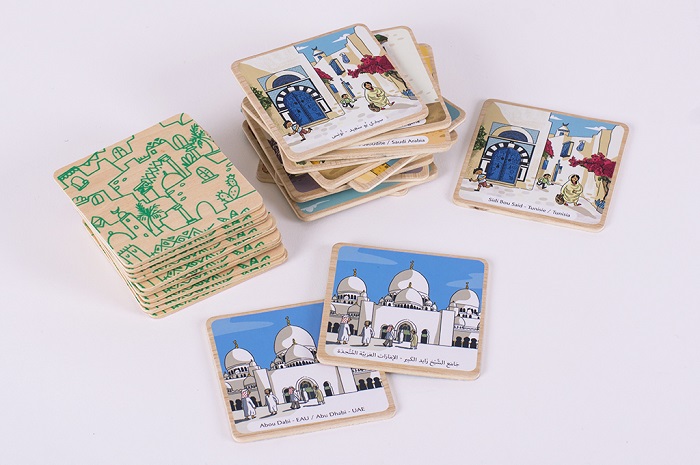 Ludique et pédagogique, Arabicity est bien plus qu’un jeu en bois ! Il s’agit d’une invitation au voyage grâce à une sélection hétéroclite de villes, de ruelles, de monuments…. L’architecture traditionnelle arabe, qu’elle soit domestique et religieuse, est représentée dans toute sa majesté.