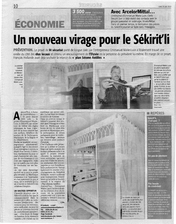 Depuis 2009, Emmanuel Marie-Luce met toute son énergie au service de son projet Sékirit’li. Pour réduire le nombre de victimes en cas de séismes majeurs, il a imaginé un lit sécurisé, véritable poche de survie pour personnes handicapées et valides. Ce concept innovant bénéficie aujourd’hui du soutien du Conseil Régional de la Martinique et des encouragements du Président de la République, François Hollande.