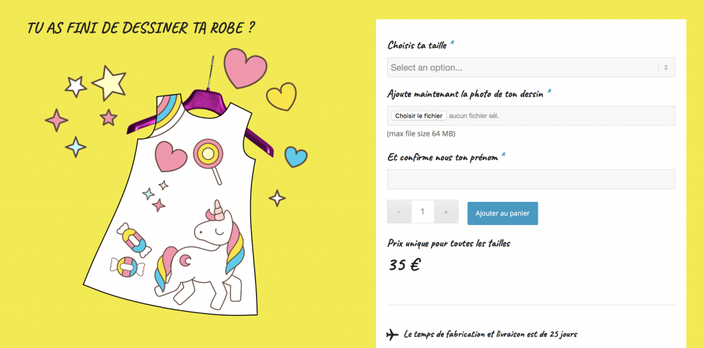 Parce que chaque dessin d’enfant est unique, nous faisons tout à la demande. Chaque création est une petite aventure, et un grand bonheur ! D’ailleurs, face au succès de notre concept, et à la demande des parents, nous envisageons déjà d’ajouter des modèles robe et tee-shirt de tailles adultes.
