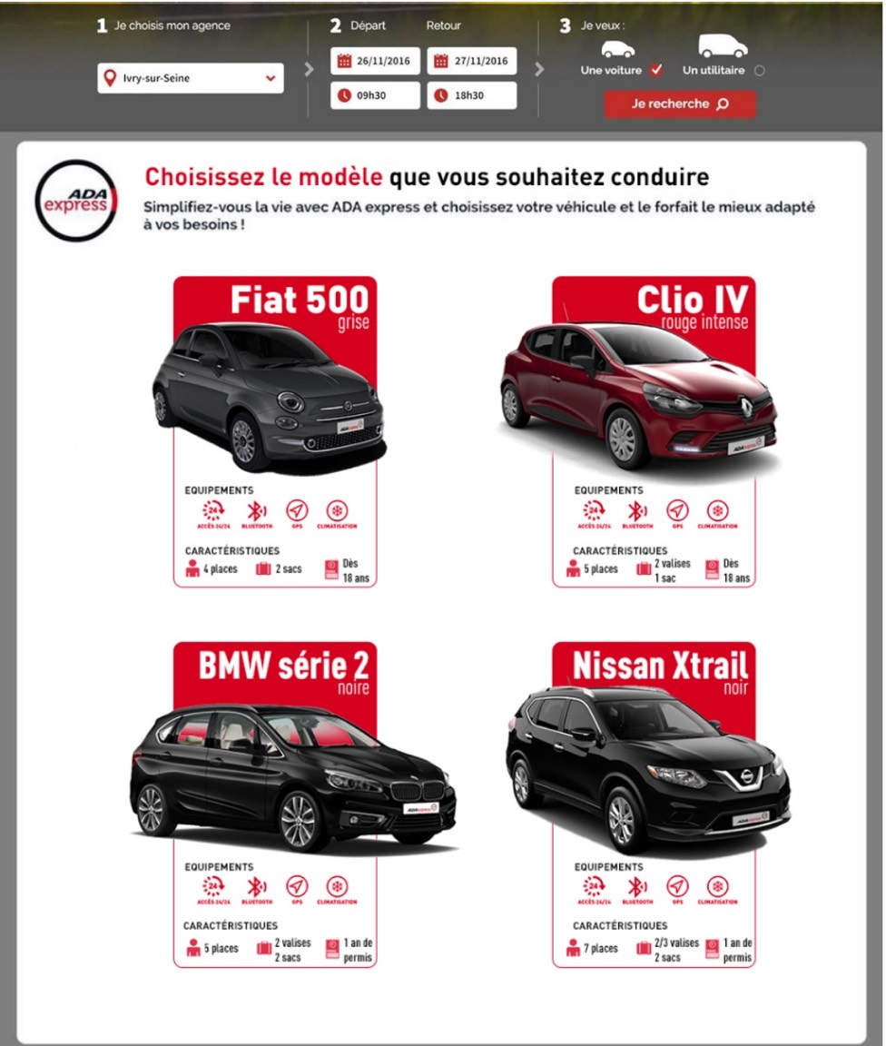 Pour lier efficacité et simplicité, ADA Express a choisi de miser sur une offre limitée de modèles, soit 4 voitures et 4 utilitaires mais aussi sur deux formules de tarifs seulement « kilométrage standard » ou « kilométrage illimité ».
