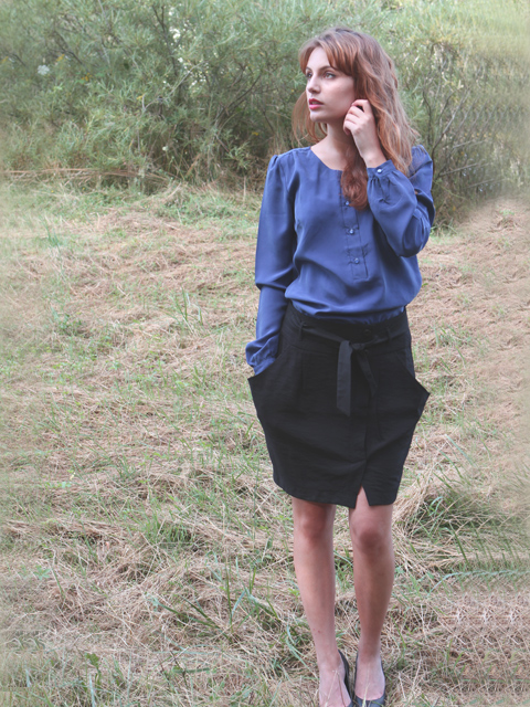 Pour un style décontracté mais chic, cette petite jupe noire est agrémentée de deux poches amples sur le côté, de deux petits boutons décoratifs et d’une ceinture à nouer en tissu soyeux ton sur ton. En soie lavée, le chemisier bleu électrique à encolure ronde apporte douceur et classe.