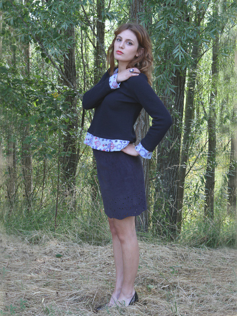 Cette jupe droite bleu nuit en alcantara, perforée à la base allie la douceur du toucher à l’originalité. A porter avec un sweat en coton marine et soie imprimée sarong navy à la coupe près du corps.