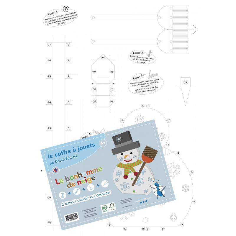 Chaque maquette géante de Dame Fourmi contient 2 fiches cartonnées au format A3 à colorier et découper, ainsi que les instructions pour assembler sa création en toute simplicité.