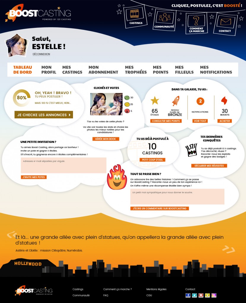Ce qui fait enfin la différence de BoostCasting, c’est que cette plateforme a délibérément choisi les tons de l’humour, du rassemblement et de la simplicité. Pas de promesse de gloire immédiate mais plutôt des actions, des incitations et des jeux pour encourager l’entraide entre tous et challenger chacun. Tout le site a été développé dans un esprit ludique et authentique, avec un ton de connivence qui permet à la fois de se sentir bien et d’être accompagné avec sérieux. Ainsi, tous les membres peuvent échanger, discuter et même se lancer des défis ou se comparer les uns aux autres, comme par exemple en votant pour les meilleures photos de candidature. Tout a été pensé pour que la communauté toute entière puisse participer à la montée en compétence et en qualité du profil artistique de chacun.