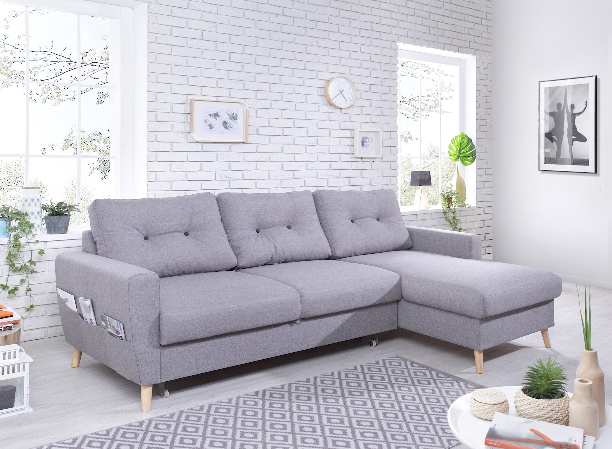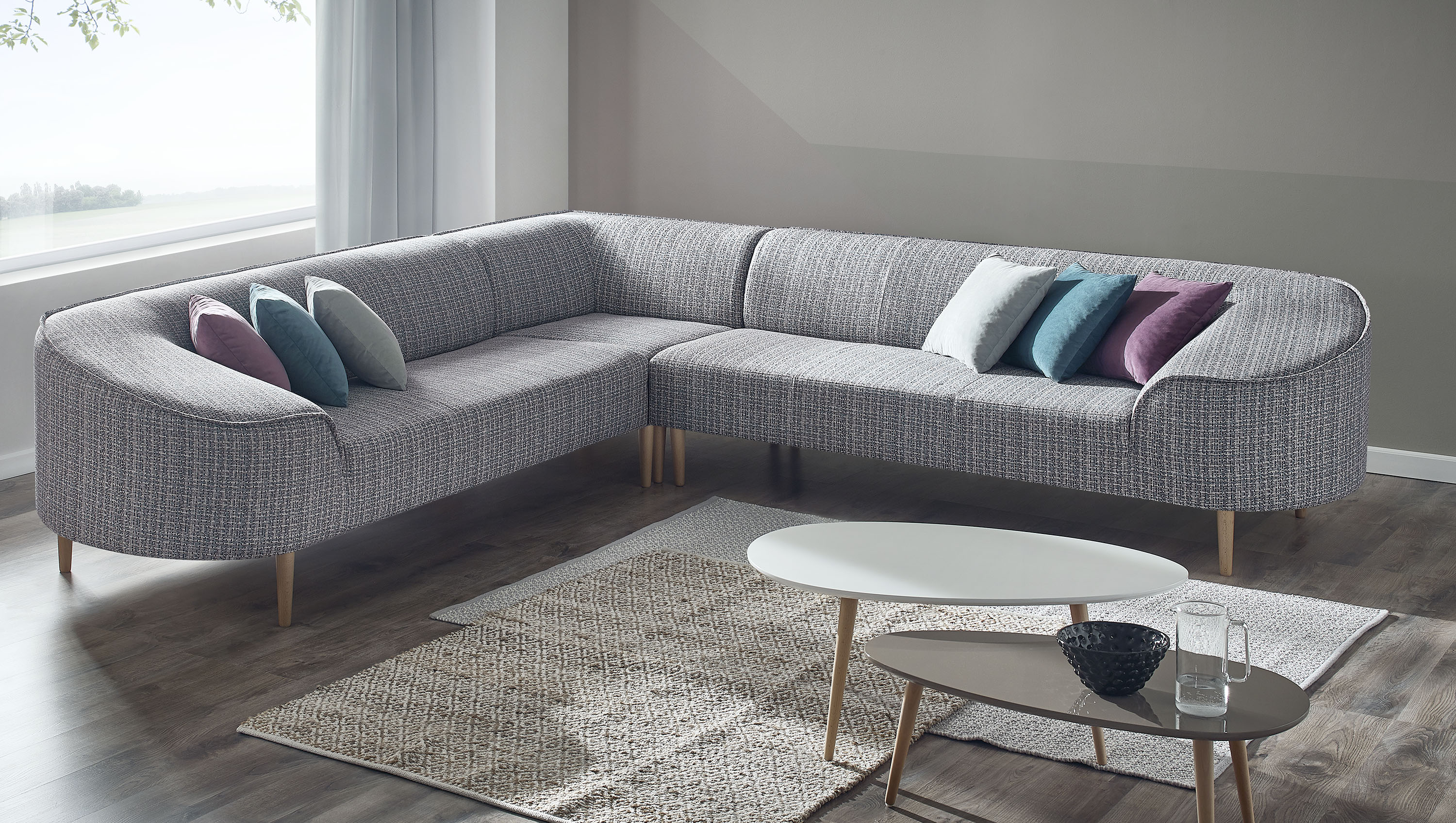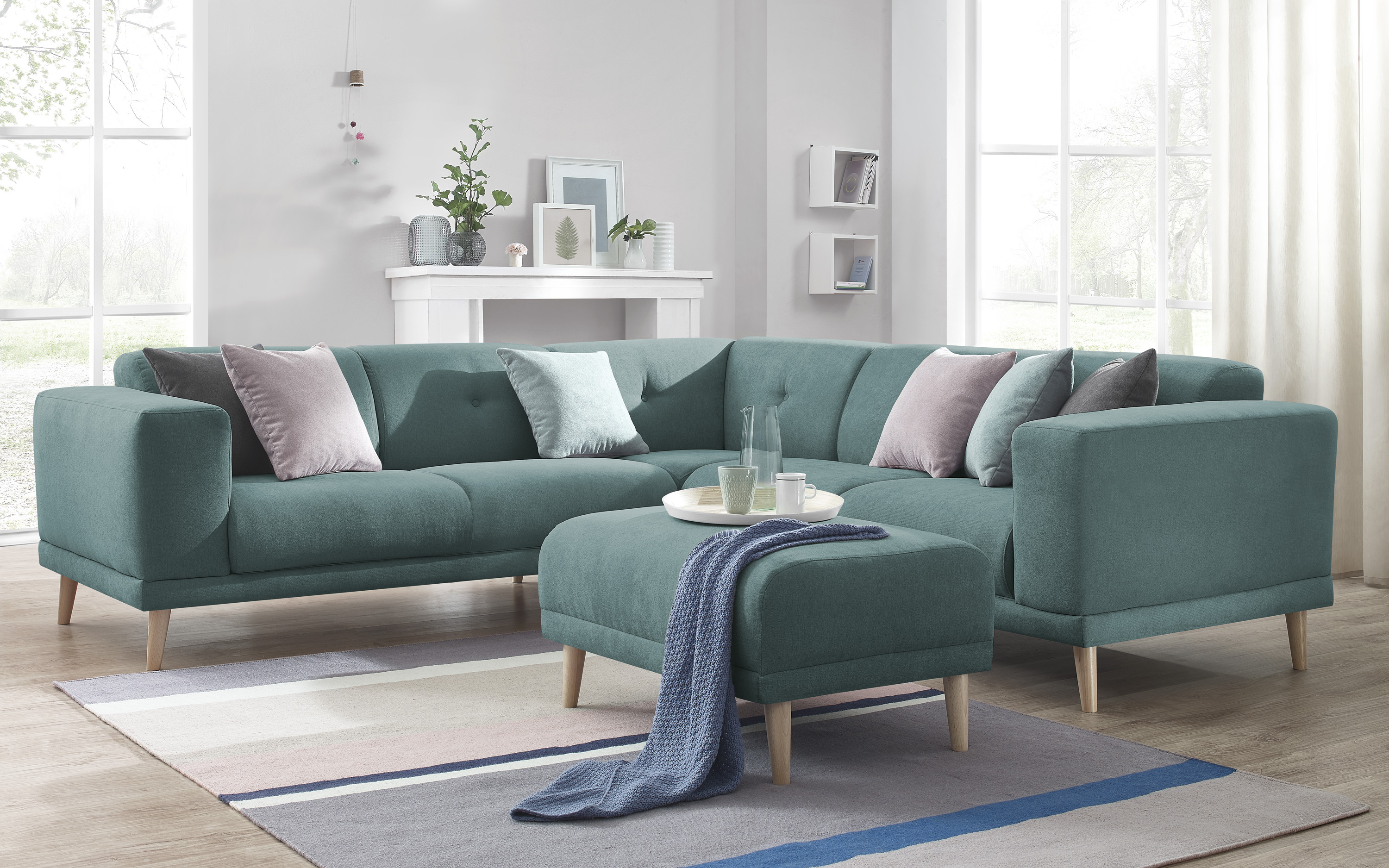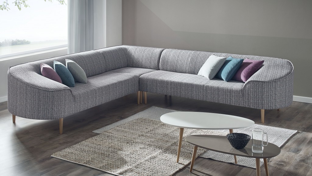 Luna est un canapé panoramique de style scandinave de six places, vendu avec un pouf assorti pouvant servir de méridienne ou de siège supplémentaire. Il se décline en trois coloris : gris clair, gris foncé , bleu canard et noir.