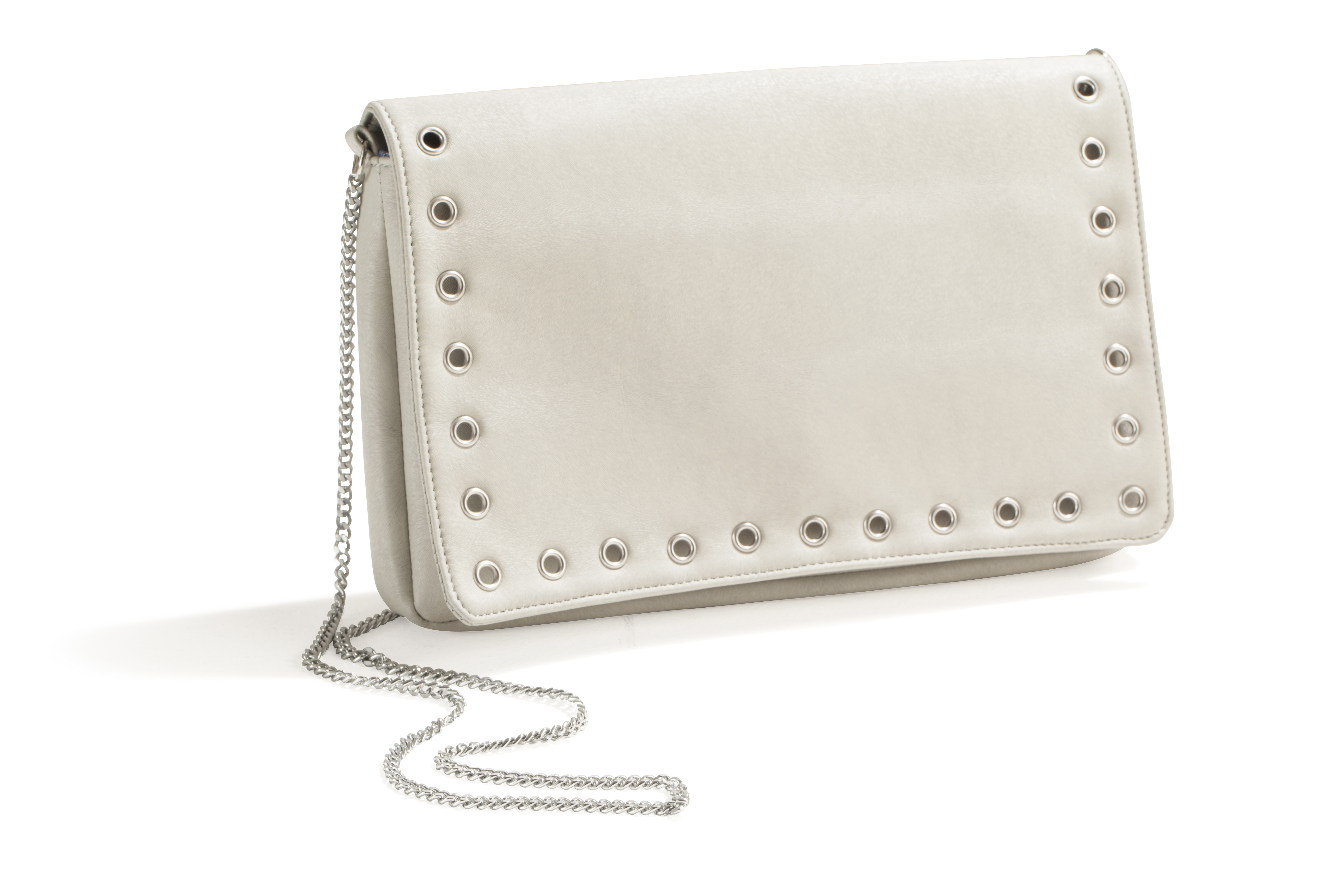 Pochette de soirée hyper chic, grège irisée, entièrement made in France. Ornée d’œillets et d’une chaîne travaillée. Elle se ferme grâce à un top magnétique.