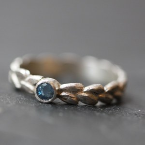 A droite : Anneau feuille, une bague telle une couronne de feuilles, en argent massif satiné et sertie d’une aigue marine. Une création originale pour une alliance… qui peut aussi être réalisée en or. Création Béatrice Knoch – 220 €