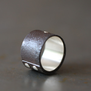 A droite : Anneau rouille & argent, une bague masculin / féminin en acier rouillé patiné et à la texture douce du cuir ciré. Rivets et intérieur en argent 925 ml. A personnaliser avec une largeur ou une gravure de son choix. Création Marianne Anselin – 160 €