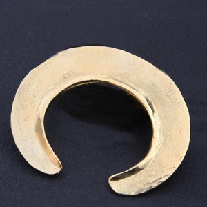 A gauche : Bracelet ellipse, en étain doré à l’or 24 carats, entièrement réalisé à la main. Rigide, il se superpose à merveille avec des bracelets manchettes, bracelets cuir et liens. Création Chantal Audias – 88 €