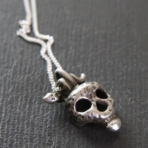A droite : Pendentif Vanité, pièce originale en argent massif (925ml) de la créatrice Boistine. Ultra tendance, ce bijou n’est pourtant pas une pièce standard ! Vendu avec sa chaine en argent de 45 cm, hauteur de la tête de mort 3 cm - Création Boistine 140 €