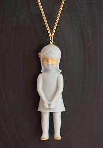 A gauche : Poupée Lou, un pendentif en porcelaine « biscuit mat » – gris bleuté. Masque en or 10K, peint à la main et chaine dorée à l’or fin (46 cm). Création Natacha Piano – 70 €