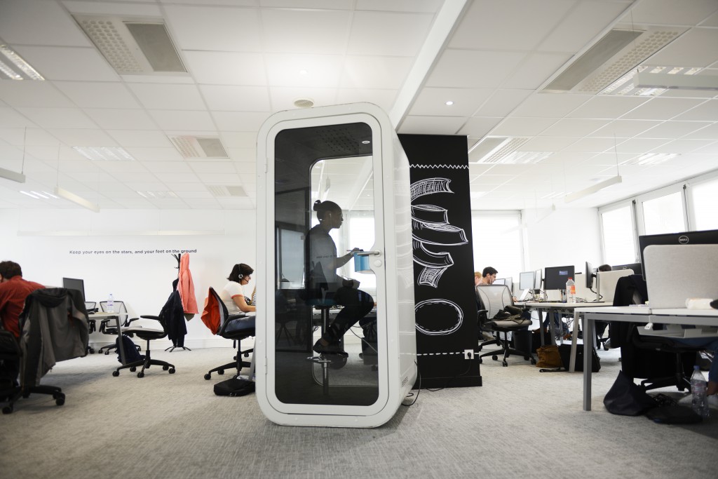Installé au beau milieu des bureaux, la cabine téléphonique permet de s’isoler pour passer un coup de fil.
