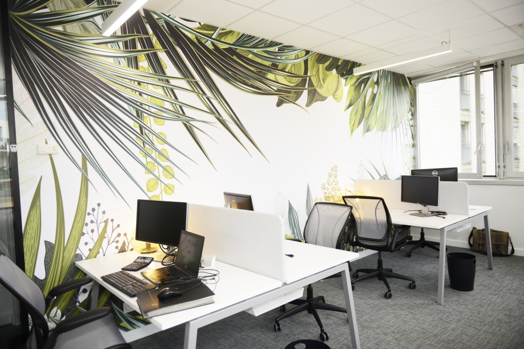 Comme son nom l’indique, la salle “silence”, agrémentée d’un imprimé “jungle” sur les murs, permet aux collaborateurs qui le souhaitent de travailler dans le calme et se concentrer sur une mission en particulier.