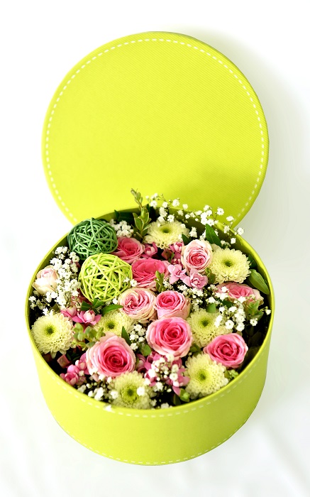Dans une jolie boîte cartonnée, aux motifs élégants, des fleurs fraîches spécialement sélectionnées pour être en harmonie de couleurs avec la boîte sont disposées sur un tapis de mousse florale.