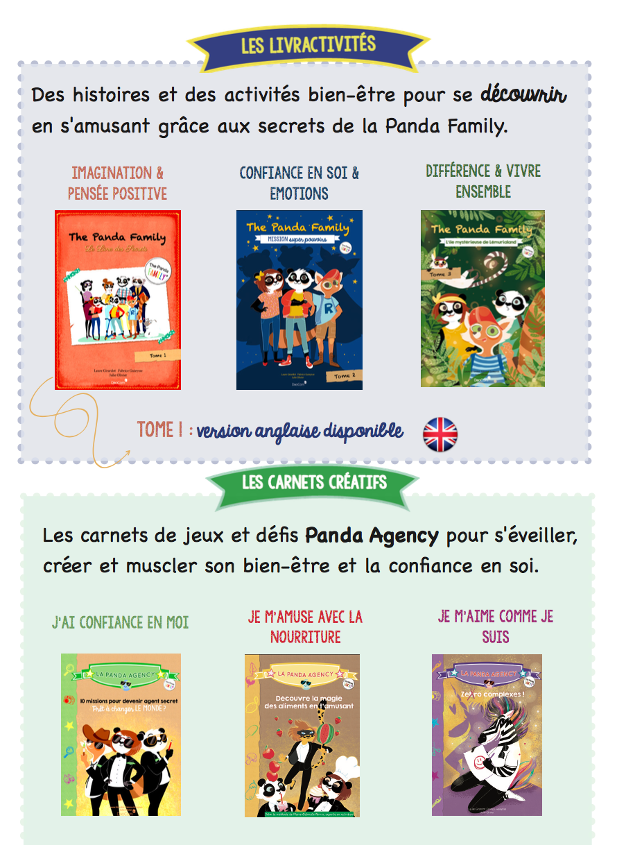 À travers sa gamme de carnets créatifs La Panda Agency, The Panda Family invite les enfants à découvrir et prendre conscience de leurs talents et de leurs forces, à gérer leurs émotions, à développer l’estime et la confiance en soi… et à s’amuser !