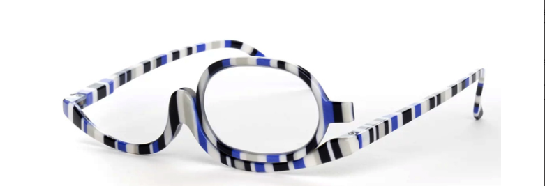 Amusantes et utiles pour les femmes coquettes souffrant de presbytie, les lunettes de maquillage. Il s’agit de lunettes à un verre pivotant de gauche à droite et de droite à gauche permettant un maquillage précis et parfait ! Elles permettent de se maquiller un œil tout en regardant au travers de la loupe avec l’autre.