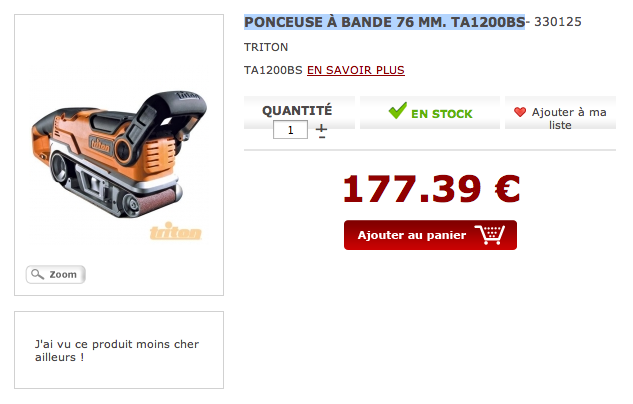 Exemple : la ponceuse à bande 76mm de la marque Triton (ref TA1200BS), en stock sur Hardeman-distribution.com est disponible à 177,39 € TTC.