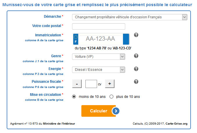 - Calcul du prix de la carte grise : L’internaute remplit le formulaire en ligne et prend connaissance du tarif légal de sa carte. Il choisit éventuellement ses plaques d’immatriculation.