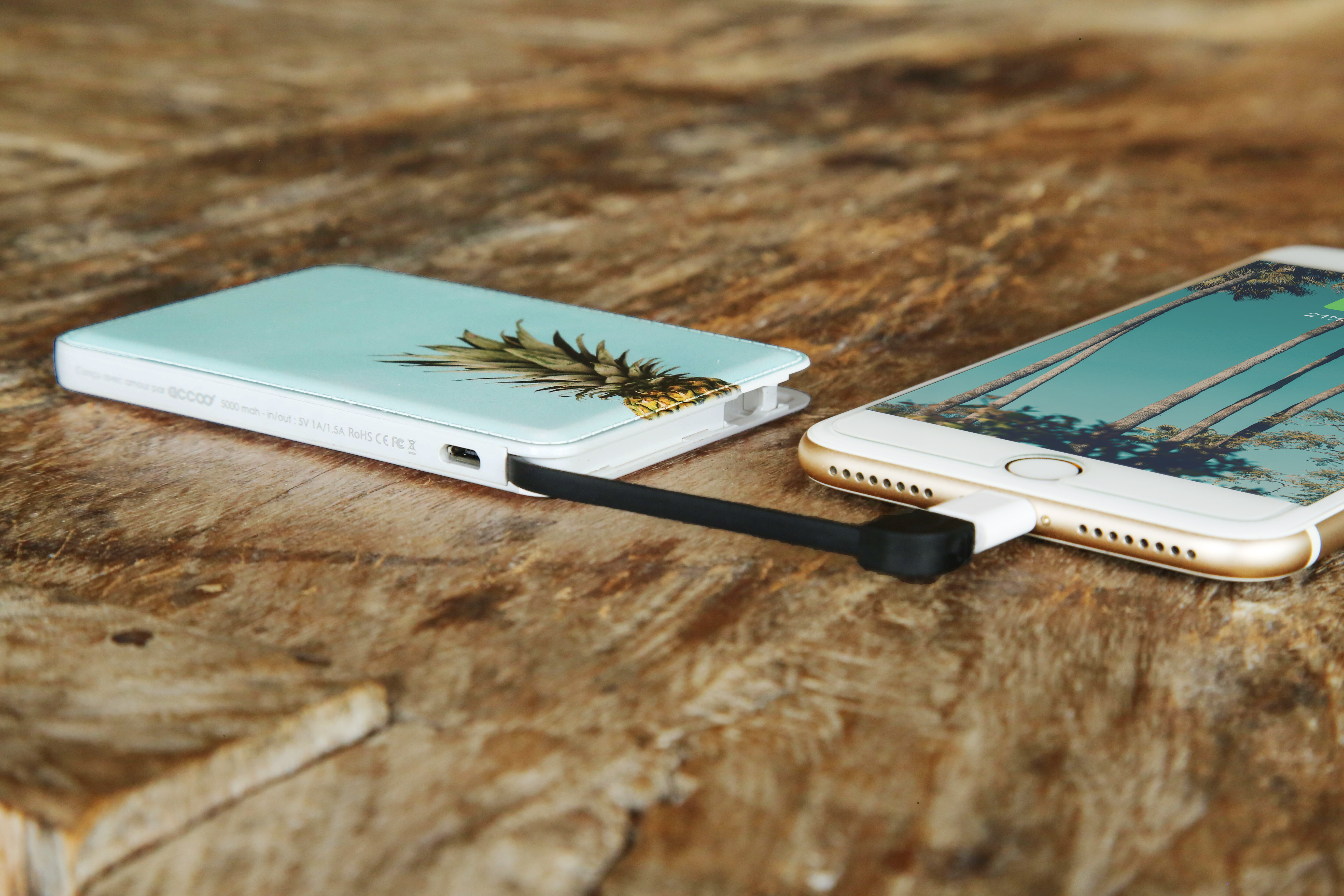 - Compatible et futée : grâce à son câble micro-USB et son adaptateur Lightning pour iPhone directement intégrés, la batterie Accoo est compatible avec tous les appareils et ne nécessite aucun câble supplémentaire ! Il est même possible d’y intégrer un adaptateur type-C.