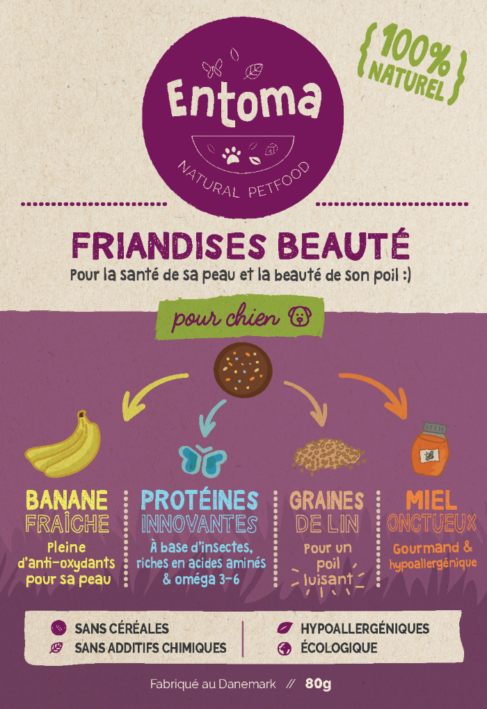 Les Friandises Beauté : conçues pour renforcer le poil et la peau, et sont à base de bananes fraîches (pleines d’antioxydants pour la peau du chien), des protéines innovantes à base d’insectes riches en acides aminés et oméga 3-6, de graines de lin, ainsi que du miel onctueux.