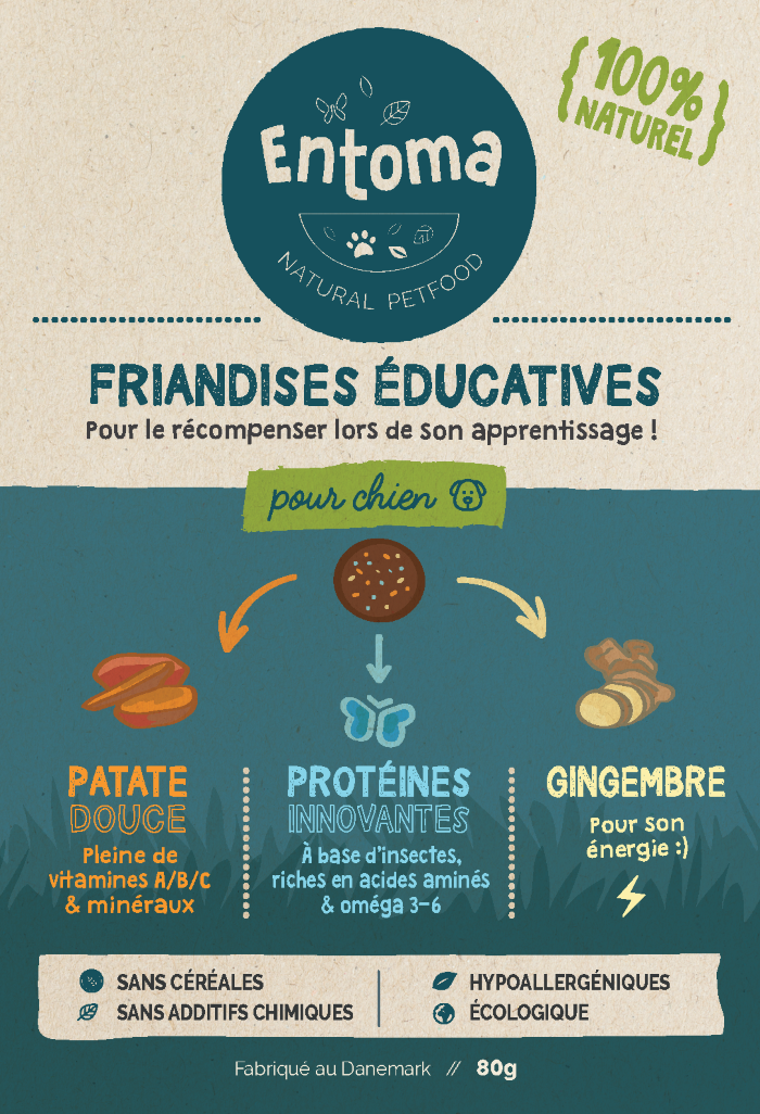 Les Friandises Éducatives : conçues pour récompenser le chien lors de son apprentissage, et sont à base de patates douces, pleines de vitamines A, B, et C et de minéraux, de protéines innovantes à base d’insectes riches en acides aminés et oméga 3-6, ainsi que du gingembre pour son énergie.