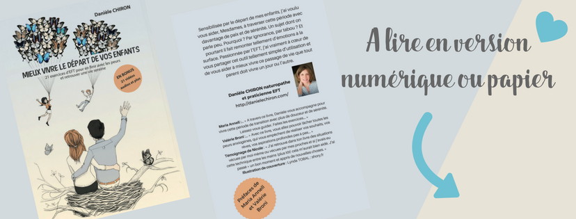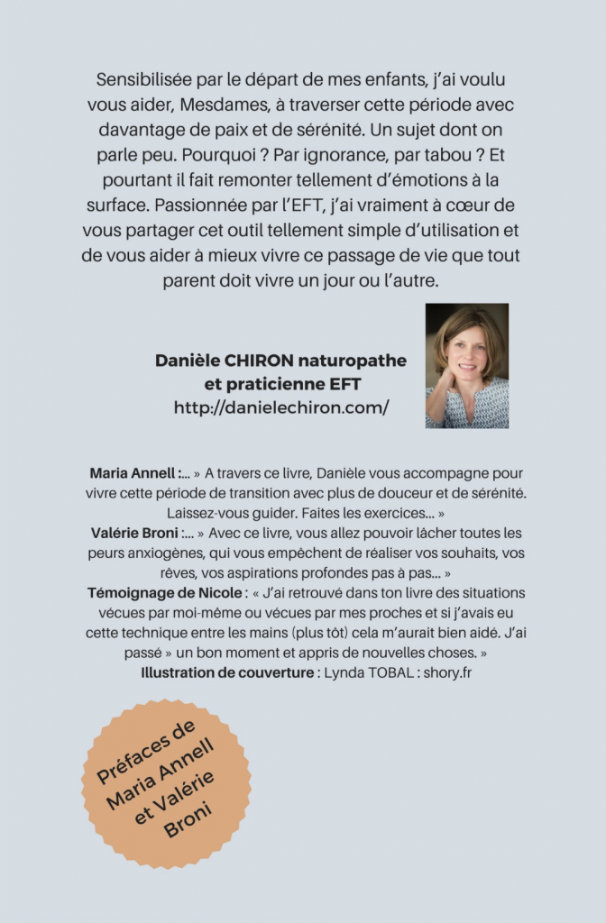 Praticienne de santé naturelle, naturopathe, EFT et Gestion de la pensée – et maman de 2 grands enfants ! – Danièle Chiron publie Mieux vivre le départ de vos enfants – 21 exercices d’EFT pour en finir avec les peurs et retrouver une vie sereine. Un guide incontournable pour apprendre simplement et en douceur à se libérer de ses émotions… afin d’éviter qu’elles ne nous rendent malades.