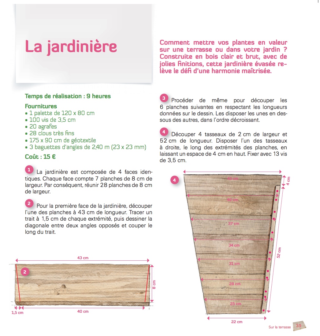 L’ouvrage de Françoise Manceau-Guilhermond permet ainsi d’acquérir un savoir-faire précieux : moyennant un peu de travail de démontage et de ponçage, les bricoleurs pourront apprendre à fabriquer un mobilier d’extérieur complètement personnalisé.