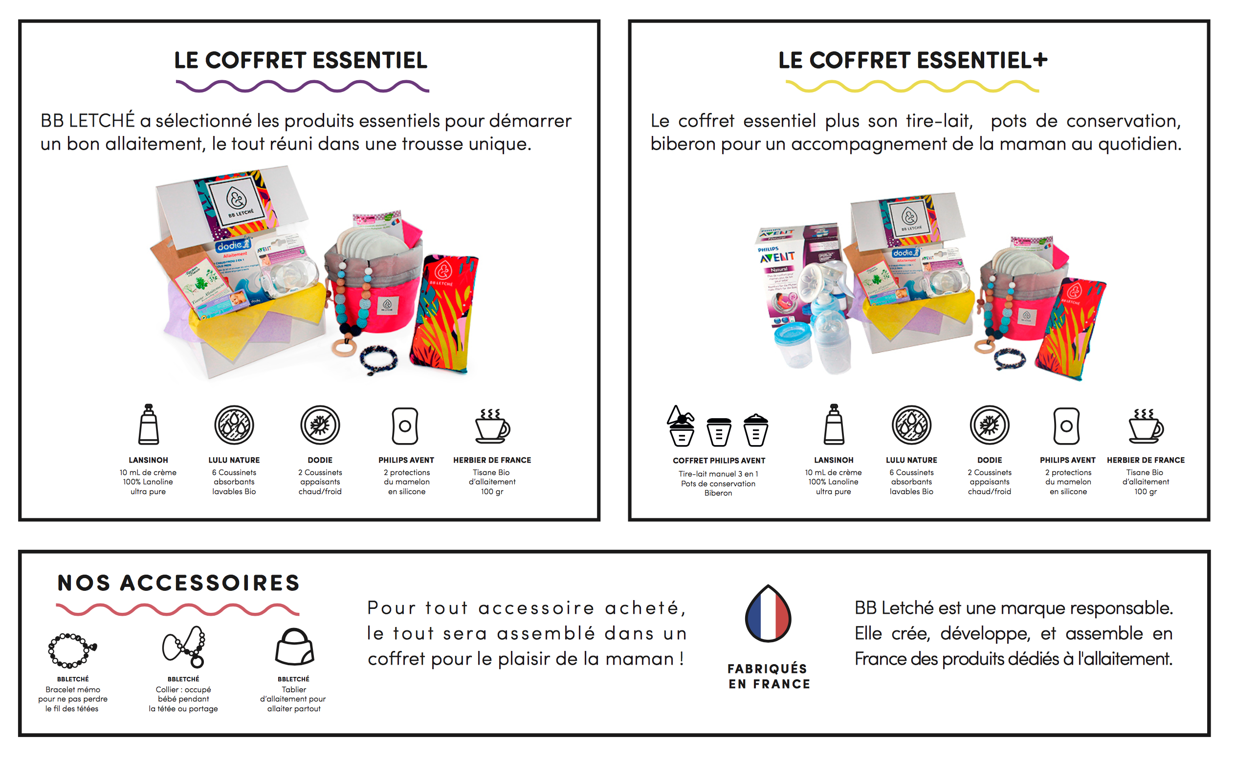 Pour le bien-être des bébés et la sérénité des parents, BB Letché créait en 2015 les premiers et uniques coffrets dédiés à l’allaitement, testés par les mamans et approuvés par les professionnels de la santé. Toujours à l’écoute des attentes des parents et en quête de perfection, BB Letché dévoile aujourd’hui une nouvelle identité visuelle, une gamme élargie de produits inédits et personnalisables ainsi qu’un nouveau site Internet permettant de concevoir ses propres coffrets.