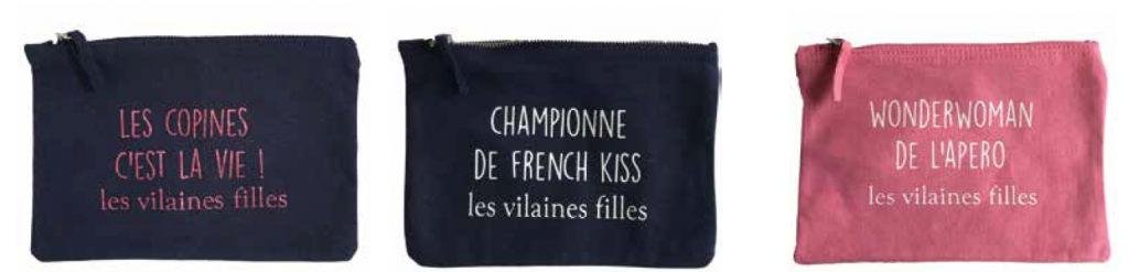 Les Vilaines filles proposent ainsi des tee-shirts, mugs, pochettes, sacs, boites à lunettes et autres accessoires sur lesquels sont inscrits des phrases humoristiques.