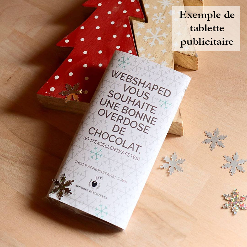 Les tablettes personnalisables d’Affaires pâtissières se présentent sous forme de tablettes « livres de poche » à dévorer et sous forme de tablettes publicitaires. Le format livre de poche impose quelques contraintes graphiques tandis que la tablette publicitaire est 100% personnalisable, hormis les mentions obligatoires.