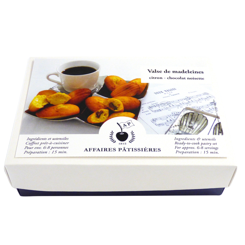 Le coffret Valse de madeleines est le petit frère de L’Heure du thé. Il permet de réaliser une vingtaine de madeleines, avec trois parfums différents : nature, avec un cœur crémeux citron, ou avec un cœur fondant chocolat noisette. Comme toujours, Affaires pâtissières a pensé à tout, et a inclus la recette et les ingrédients de base, justement dosés.
