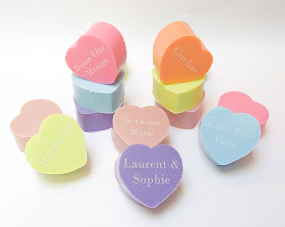 - en cœurs avec de petits mots gravés (tarif : 4€ le savon gravé)