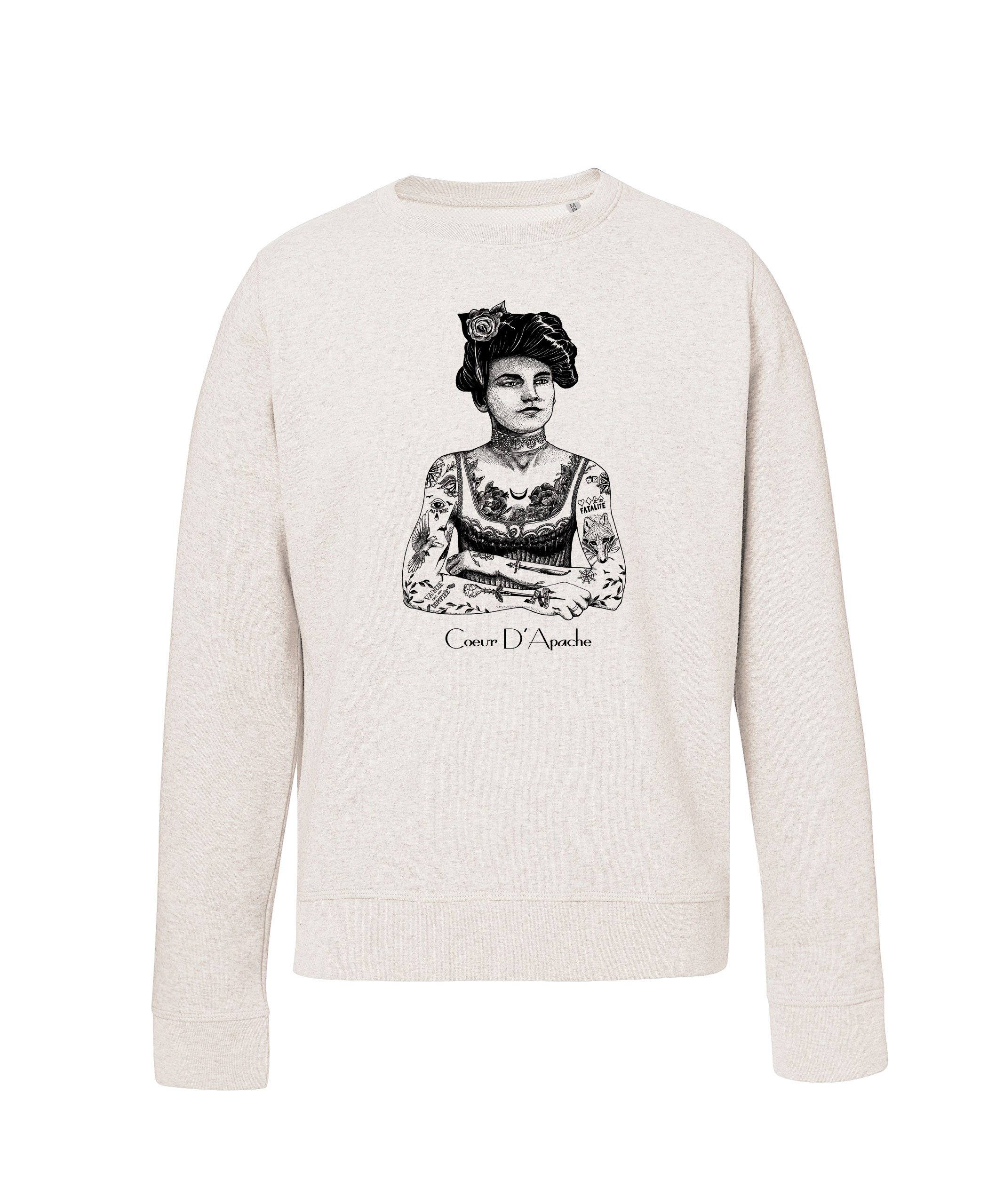 De couleur crème, ce sweat unisexe est fait de coton bio et de polyester. Avec un grammage de 300/m2, il est très confortable. Sa coupe est cintrée. Son illustration a été réalisée par Charles Addad, spécialiste du dotwork, et imprimée à Paris.