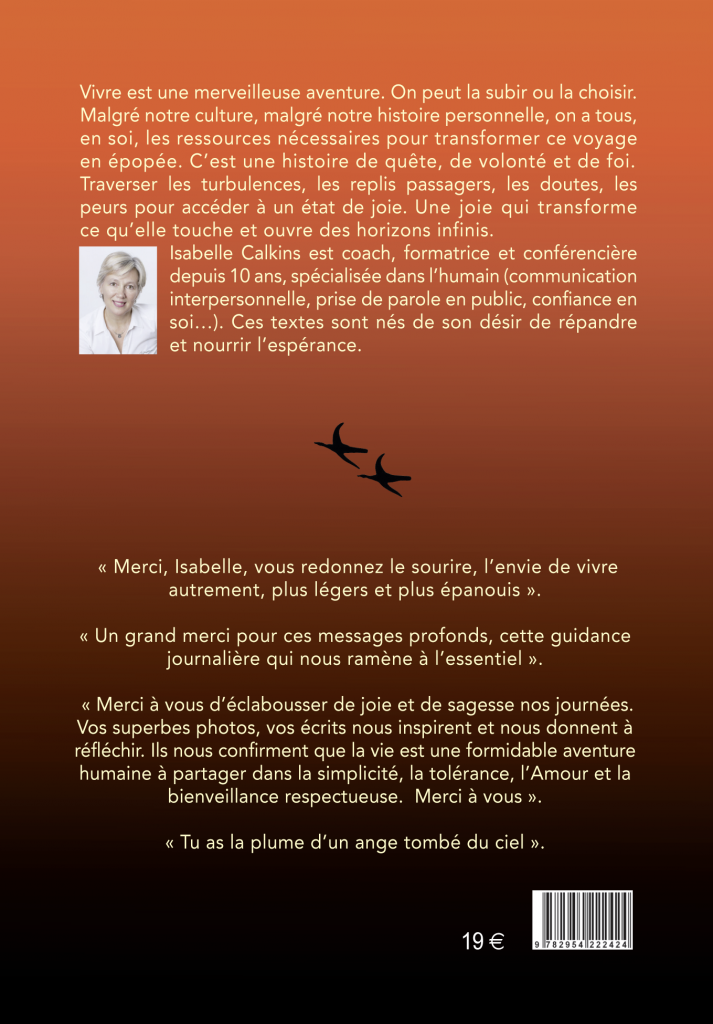 Pour que la joie de vivre, l’optimisme et la confiance soient vécus au quotidien par tous, Isabelle publie un recueil de petits bonheurs intitulé « La vie se voyage, 365 jours pour vivre en joie ».