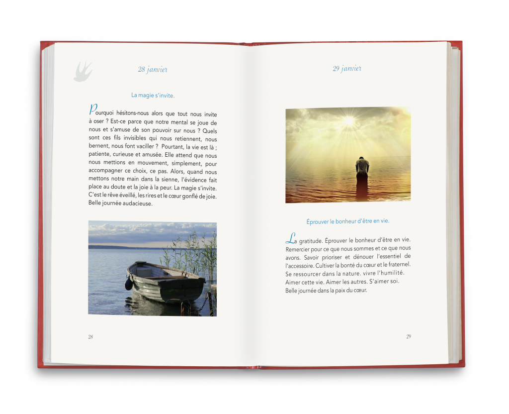 Cette alliance du texte et de l’image agit comme une petite entrée en méditation, une pause qui invite le lecteur à l’introspection ou l’amène à constater que le bonheur est à portée de main. Une page par jour, comme une touche de rappel quotidienne qui permet de nous ramener à l’essence des choses, tout en lucidité, en subtilité et en douceur.