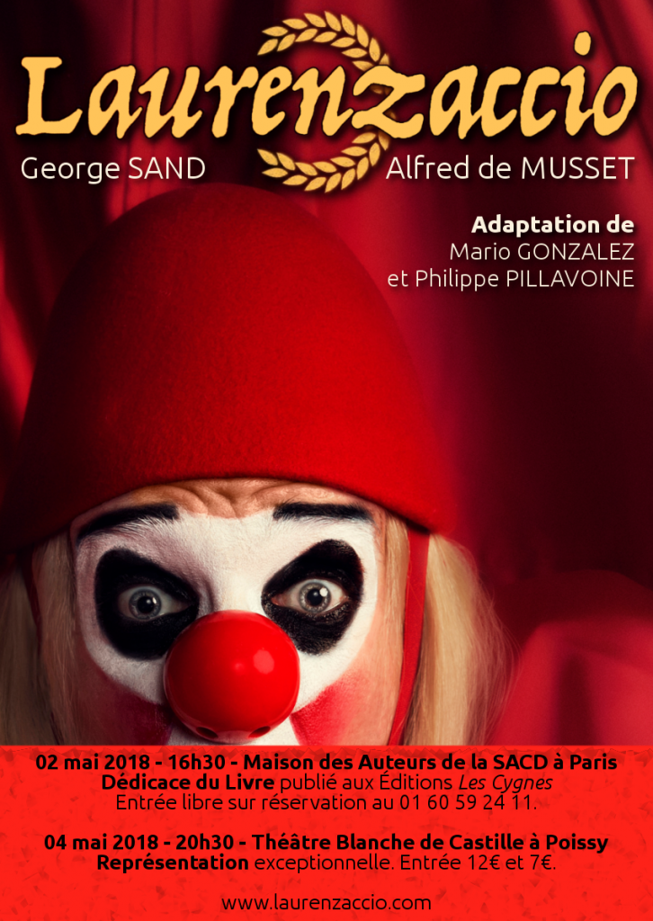Après 3 représentations à Allonnes (72) au Théâtre de Chaoué Port Belle Eau puis grâce à l’invitation de Christian Sterne de la compagnie Les fous de Bassan ! à Beaugency (45) au Théâtre le Puits-Manu, Laurenzaccio foulera pour la première fois les planches de la région parisienne, le vendredi 4 mai 2018 à 20h30 au Théâtre Blanche de Castille à Poissy (78).