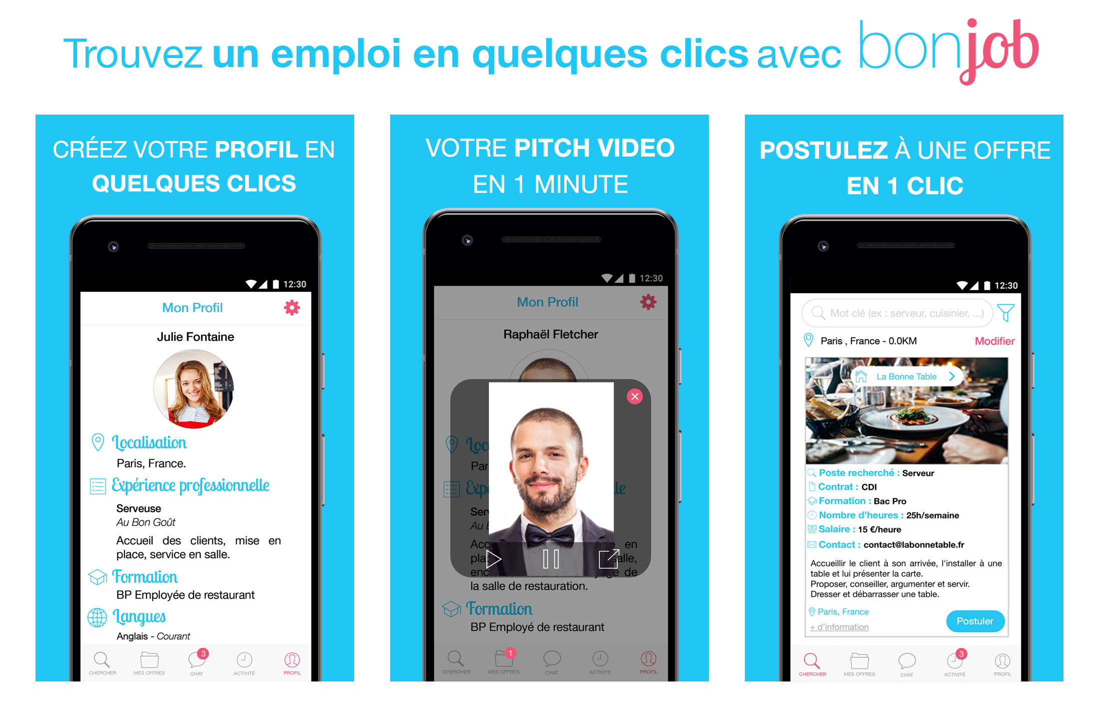 - BonJob est la seule appli emploi à proposer la fonctionnalité de « pitch vidéo » qui permet des présentations d’1 minute maximum