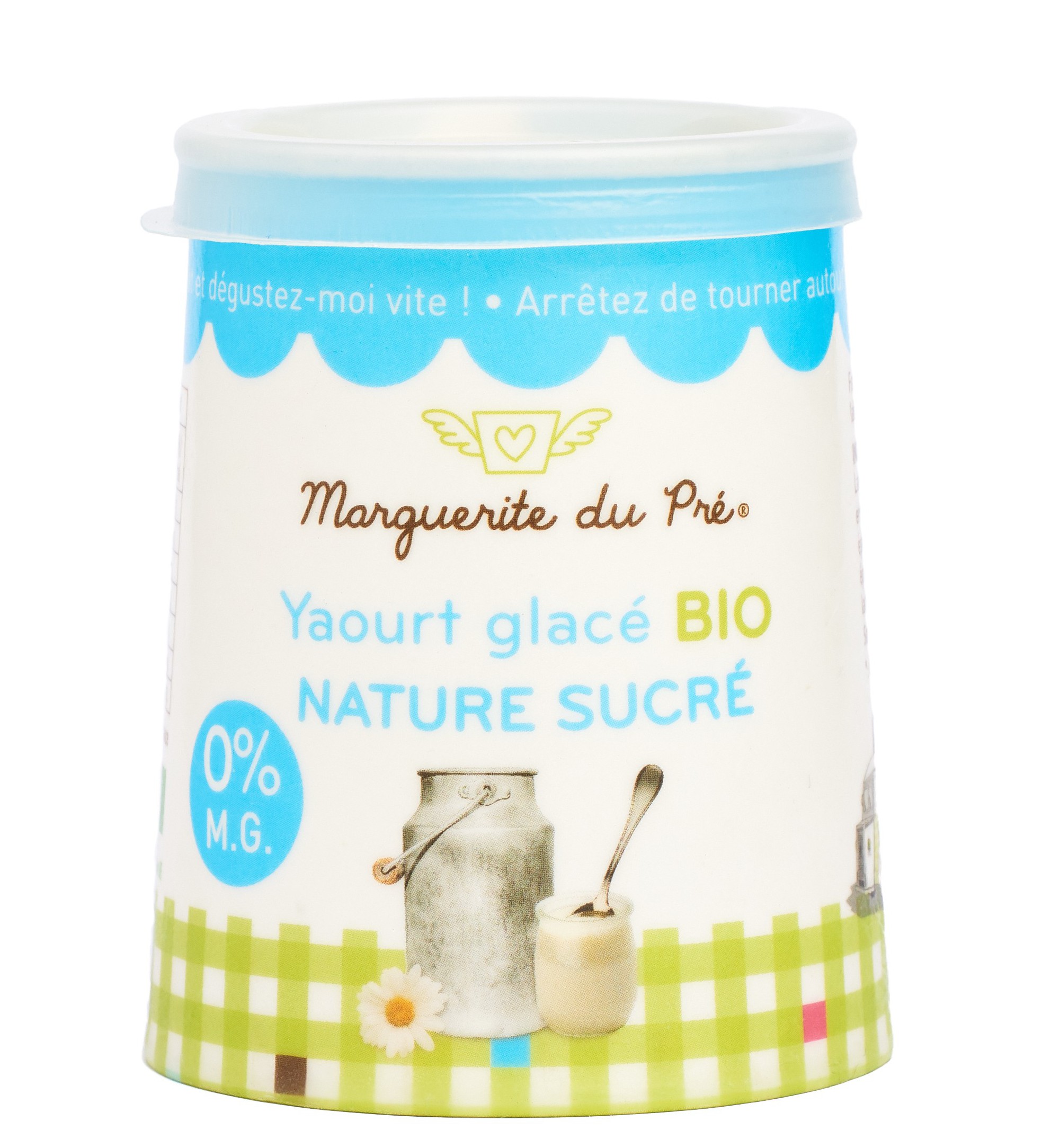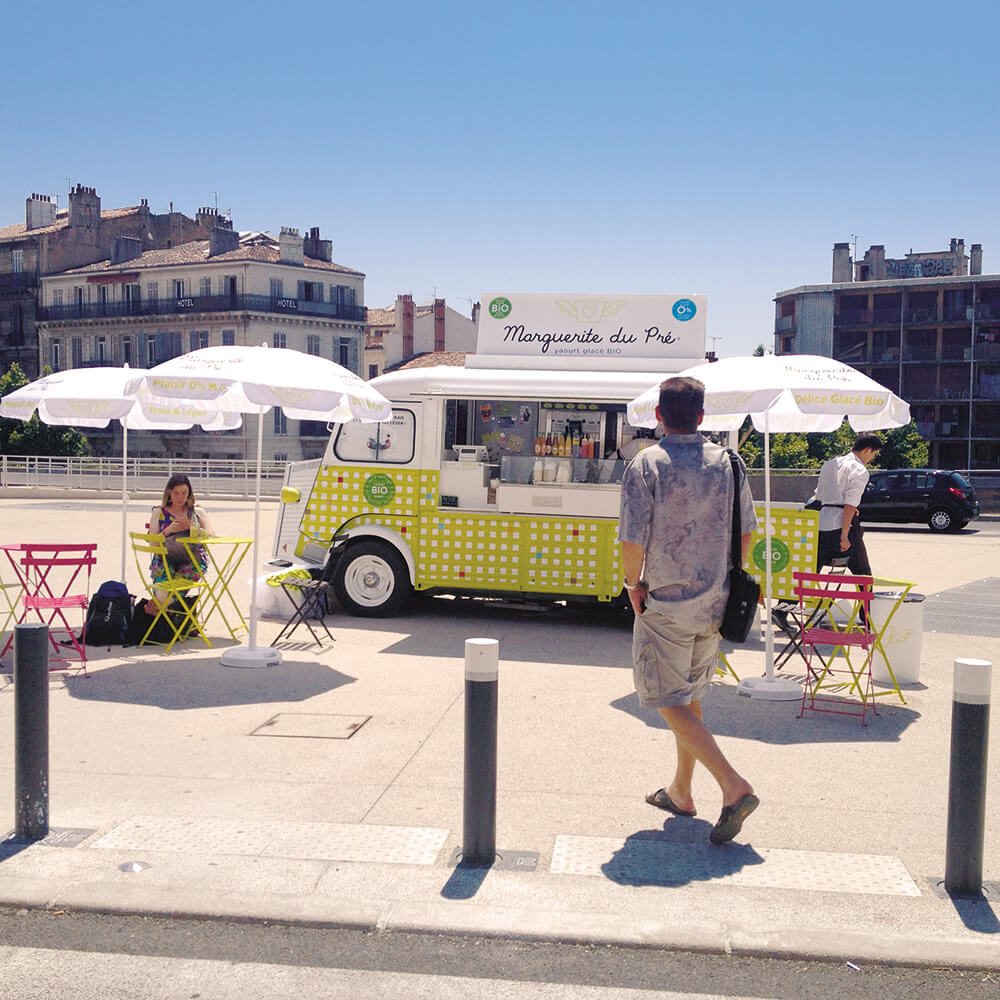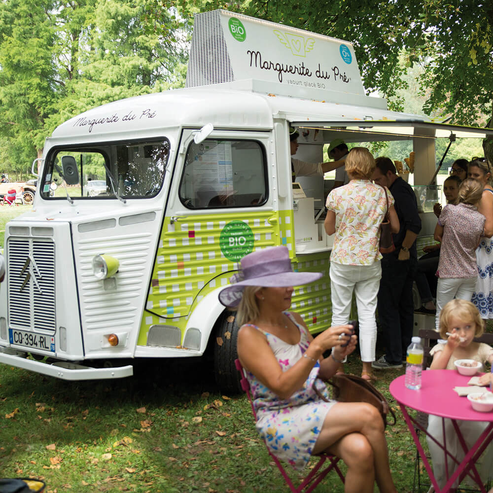 Fabriqués en France et garantis 0% de matière grasse, les Yaourts Glacés BIO Marguerite du Pré® sont servis dans la mythique Camionnette Citroën HY Vintage, habillée d’un vichy vert, à la fois champêtre et bucolique.