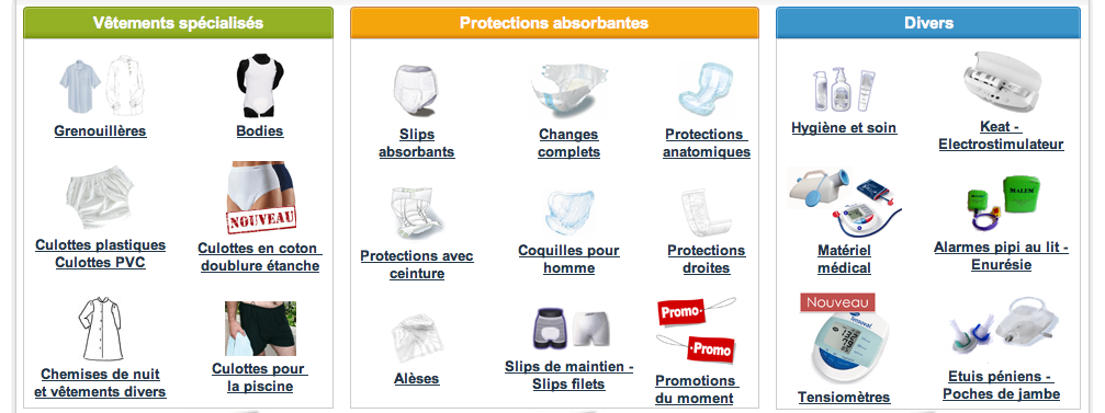 Pour l’incontinence légère : des protections anatomiques de petite taille, très discrets. Pour les hommes, les fabricants proposent des protections sous forme de coquille afin de s’adapter à l’anatomie du corps. Pour les femmes, ces protections s’apparentent à des protections périodiques tout en disposant de capacités d’absorption beaucoup plus importantes et adaptées aux flux urinaires.