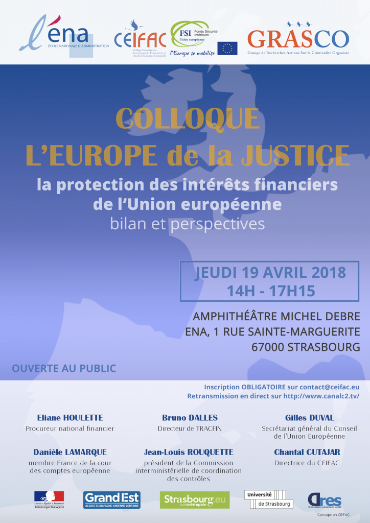 Spécialisé dans la formation des autorités de poursuite aux investigations financières à l’analyse financière criminelle, le CEIFAC (Collège Européen des Investigations Financières et de l’Analyse Financière Criminelle), en collaboration avec l’École nationale d’administration (ENA) organise le jeudi 19 avril 2018 un colloque qui se propose de dresser le bilan et de dessiner les perspectives de l’Europe de la Justice, à l’aune de l’entrée en fonction du nouveau parquet européen à l’horizon 2020.