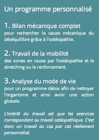Un bilan mécanique complet, le travail de la mobilité et l’analyse du mode de vie garantissent une réponse personnalisée et complète, aussi bien préventive que curative. Le travail de zones clés du corps permet en effet d’améliorer le fonctionnement des organes et optimise le capital santé.