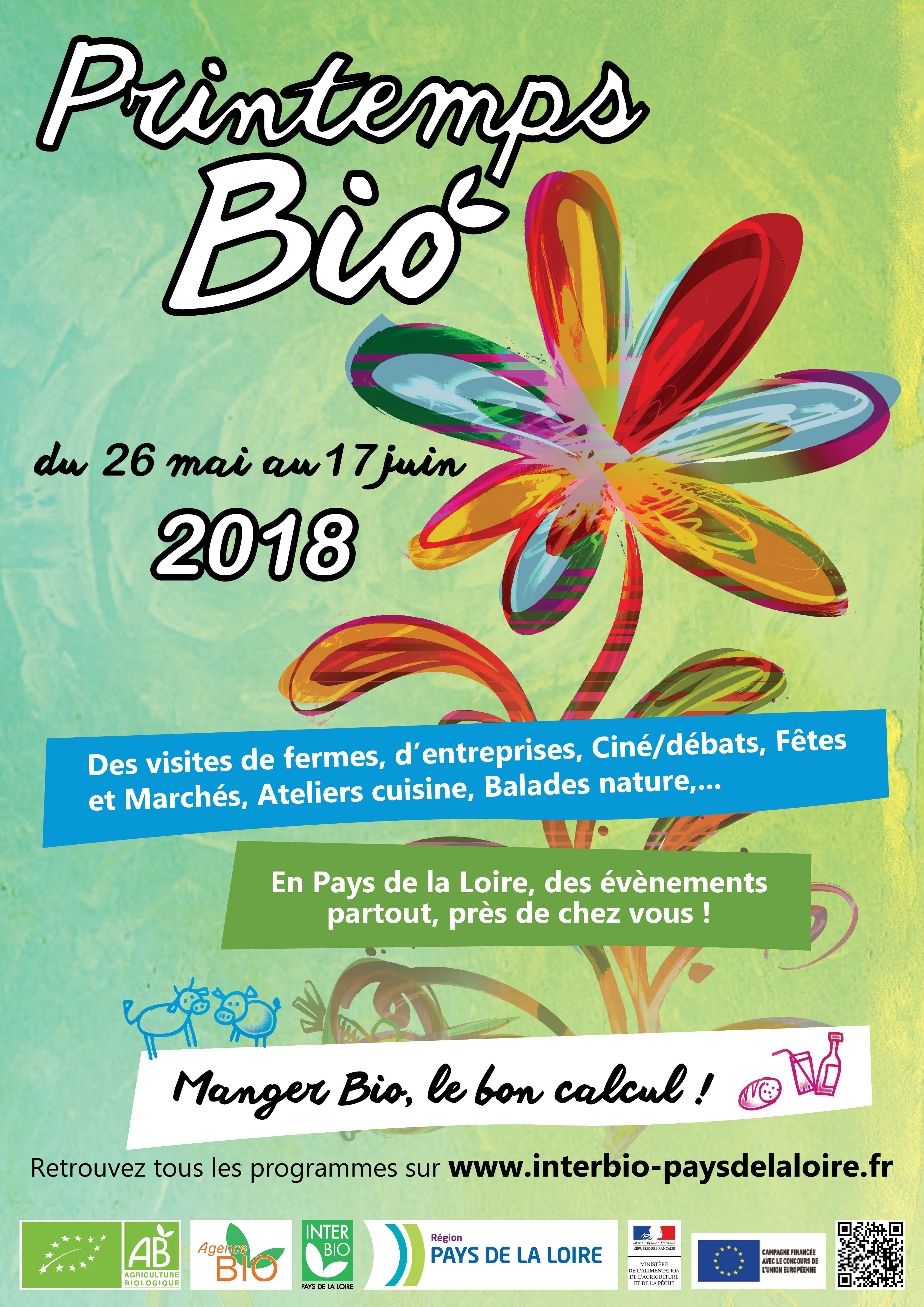 Avec le soutien de ses partenaires – les GAB et le civam bio Mayenne, Entrepreneurs bio des Pays de la Loire, Bio Loire Océan, les magasins spécialisés Bio, les associations INFO vie Bio et Bio Consom’acteurs pays d’Angers – Inter Bio Pays la Loire organise, du 26 mai au 17 juin 2018, la 15e édition du Printemps Bio, une manifestation riche d’une centaine de rendez-vous sur les 5 départements de la région !