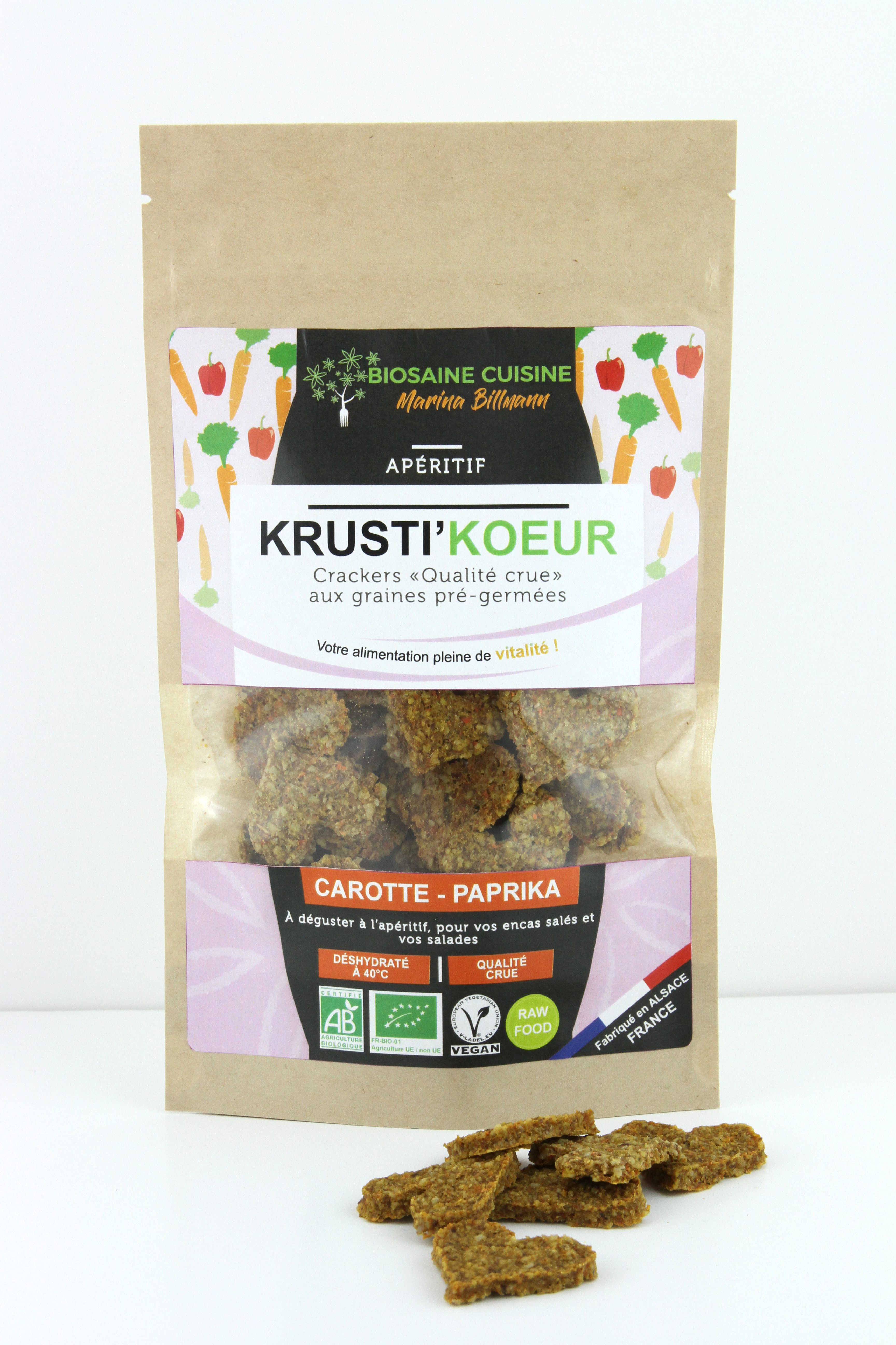 Les Krusti’koeurs carotte-paprika sont réalisés artisanalement en Alsace à base de carotte fraîche avec les techniques de la « rawfood », la cuisine crue. Pour laisser les ingrédients le plus proche possible de leur état naturel, Marina Billmann les déshydrate à une température inférieure à 42°C. Ce procédé de déshydratation, ajouté à la pré-germination des graines utilisées est la base des produits de Biosaine Cuisine. Ces techniques issues de la “rawfood”, cuisine crue, permettent de préserver le goût et les enzymes tout en augmentant les qualités nutritionnelles de la nourriture.